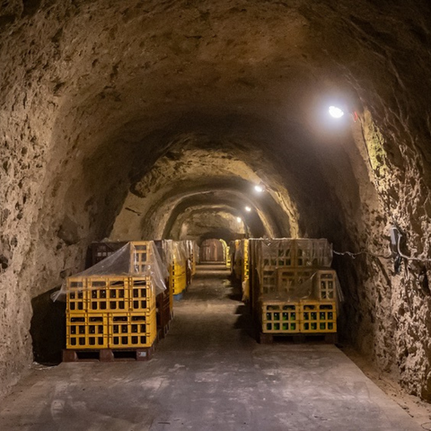 garantisce la totale assenza di luce e una temperatura costante di 10°, condizioni perfette per la conservazione di circa 100.000 bottiglie.